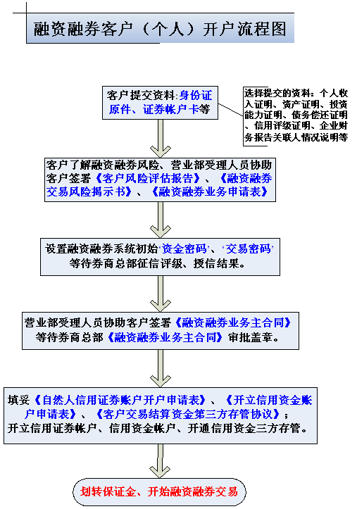 1、(《融資融券業(yè)務(wù)主合同》經(jīng)總部審批通過(guò)后)根據個(gè)人基本資料,填妥《自然人信用證券賬戶(hù)開(kāi)戶(hù)申請表》后,客戶(hù)簽字確認,由營(yíng)業(yè)部協(xié)助開(kāi)立上海、深圳信用證券賬戶(hù);上海信用證券賬戶(hù)下一個(gè)交易日由營(yíng)業(yè)部申報指定交易;
